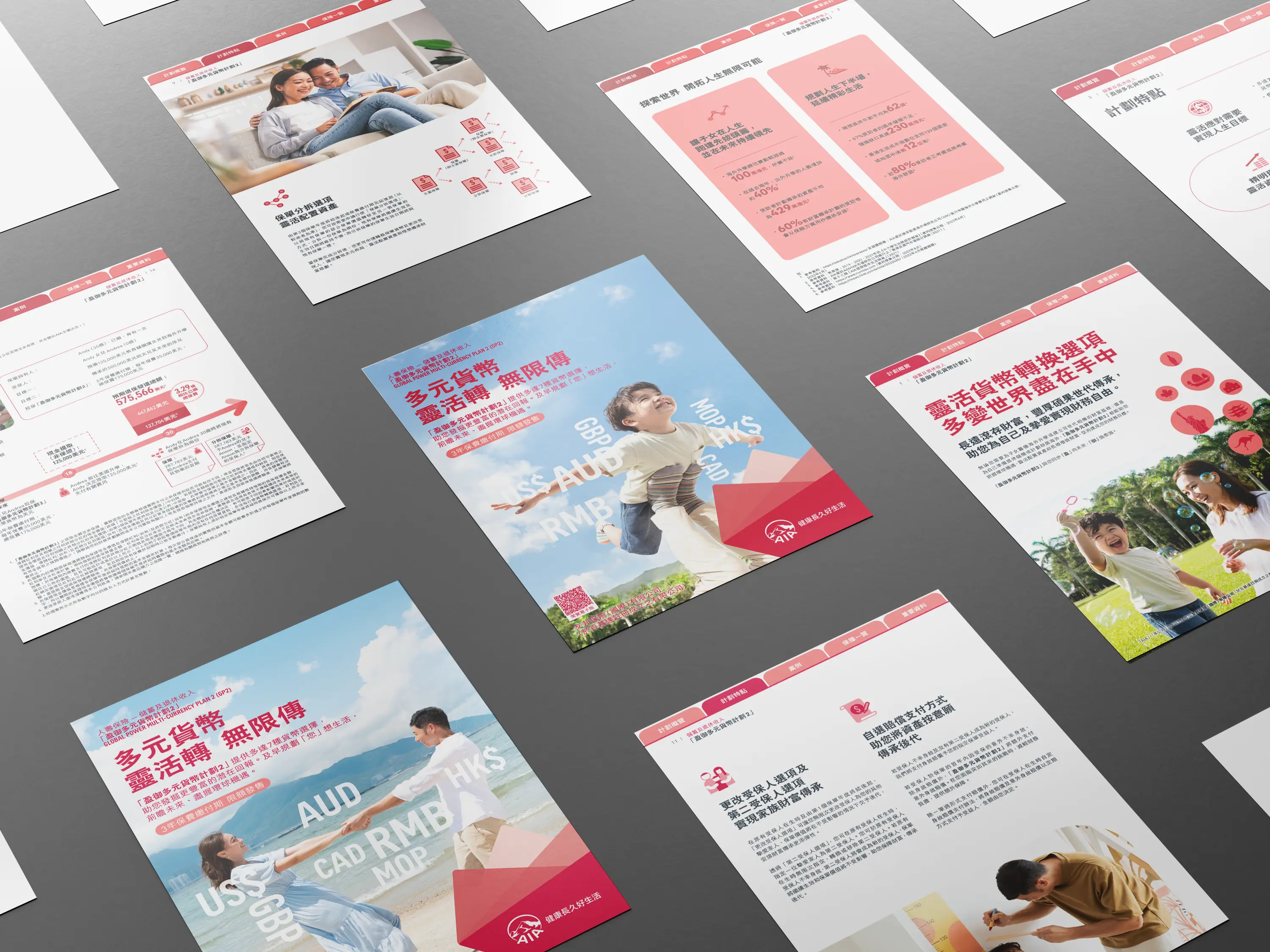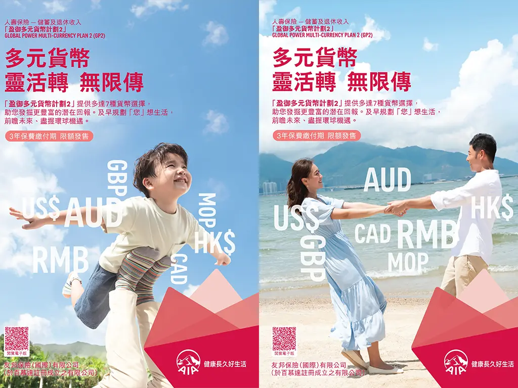 AIA's Global Power Multi-Currency Plan 2 branding aimed to create a cohesive yet flexible identity appealing to diverse audiences. It communicated financial benefits clearly to all life stages, from young couples to retirees, focusing on global investment opportunities, flexible asset allocation, and long-term wealth growth while ensuring demographic consistency.